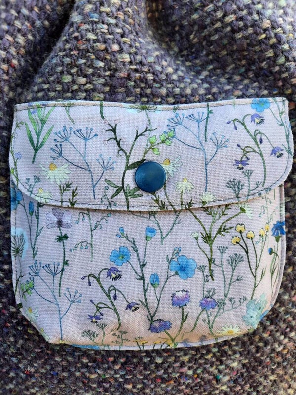 - Aufgenähte Tasche, die mit einem Druckknopf verschlossen wird