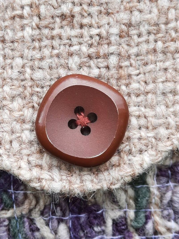 aufgesetzte Taschen: Gemisch aus diversen selbst gesponnenen Wollfäden von Eifeler Schurwollen, verbunden mit Baumwollfaden