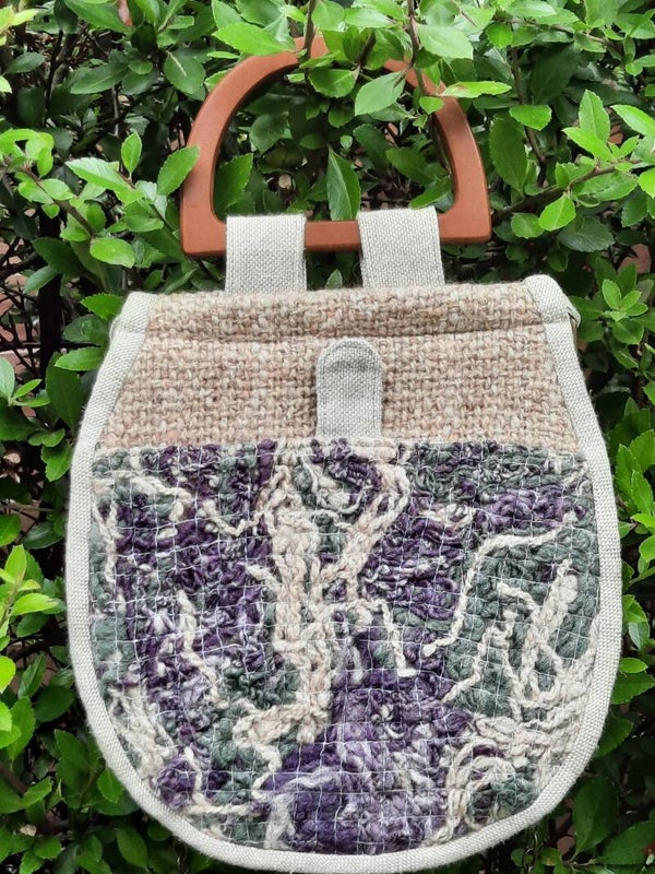 - Der Stoff dieser bezaubernden Handtasche, in Form einer Satteltasche, ist aus selbst gesponnener Wolle handgewebt und mit Leinenstoff verstärkt.