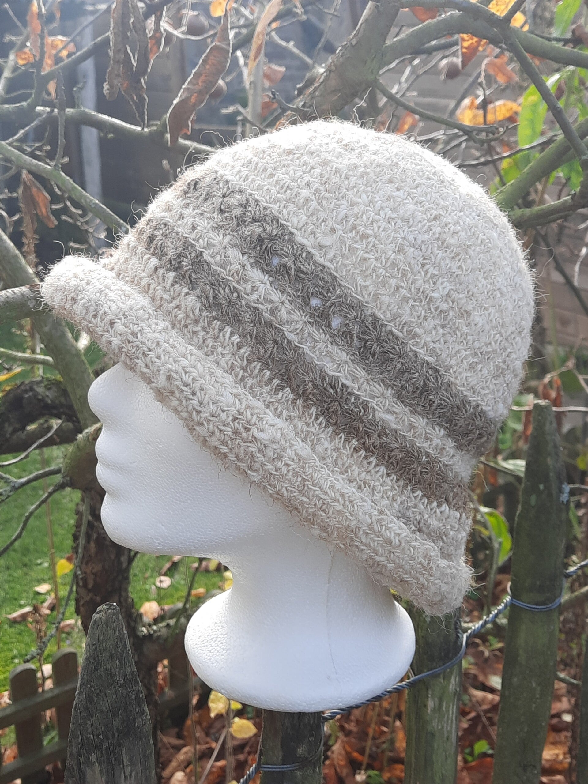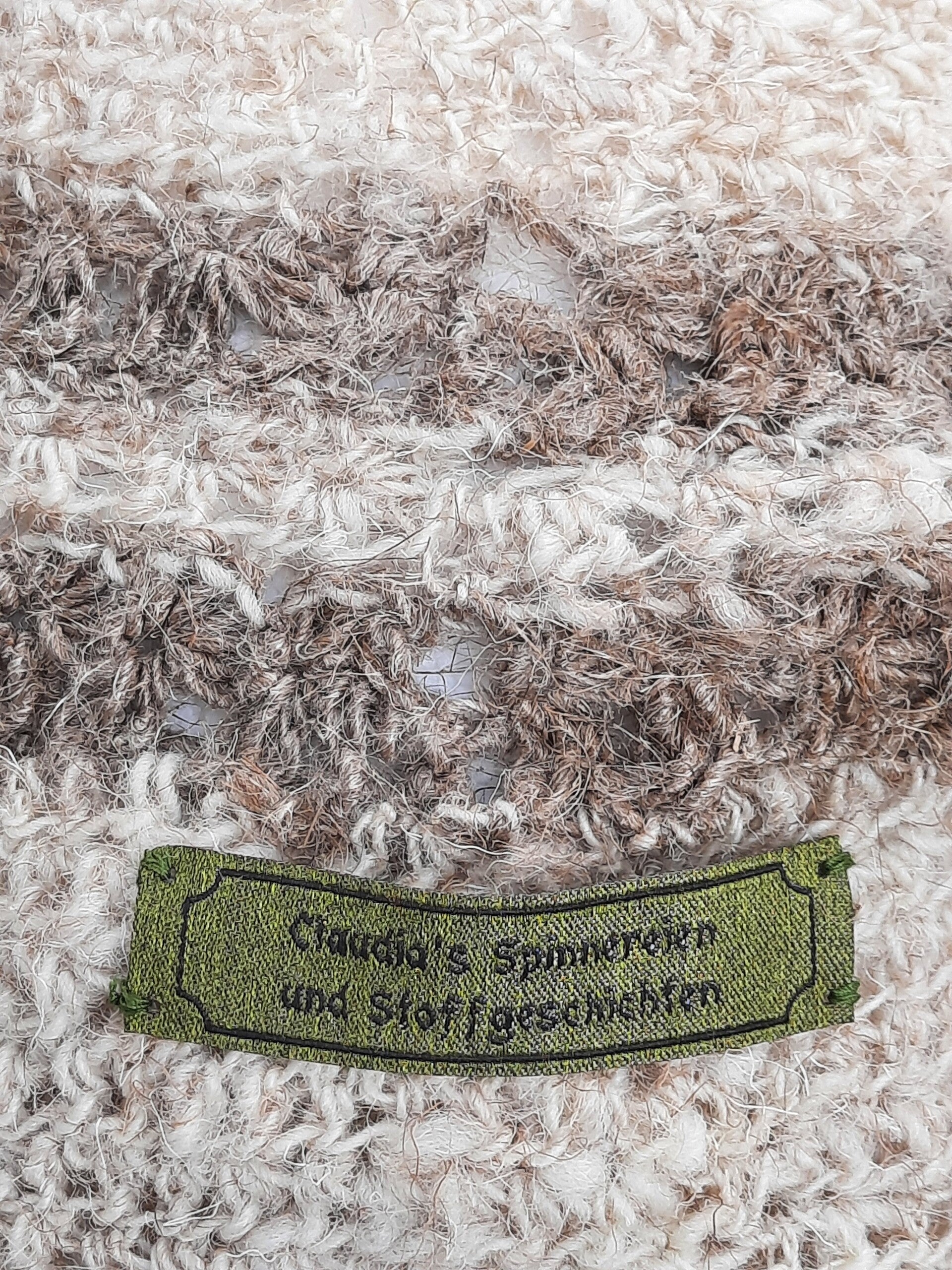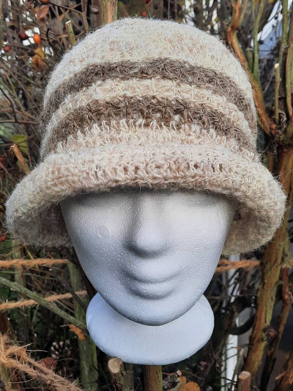Unikat – vom Auflockern, Waschen und Kardieren des geschorenen Schafvlieses, über die selbst gesponnene Wolle bis zum fertigen Häkelhut von Claudias Spinnereien und Stoffgeschichten zu 100% handgefertigt!
