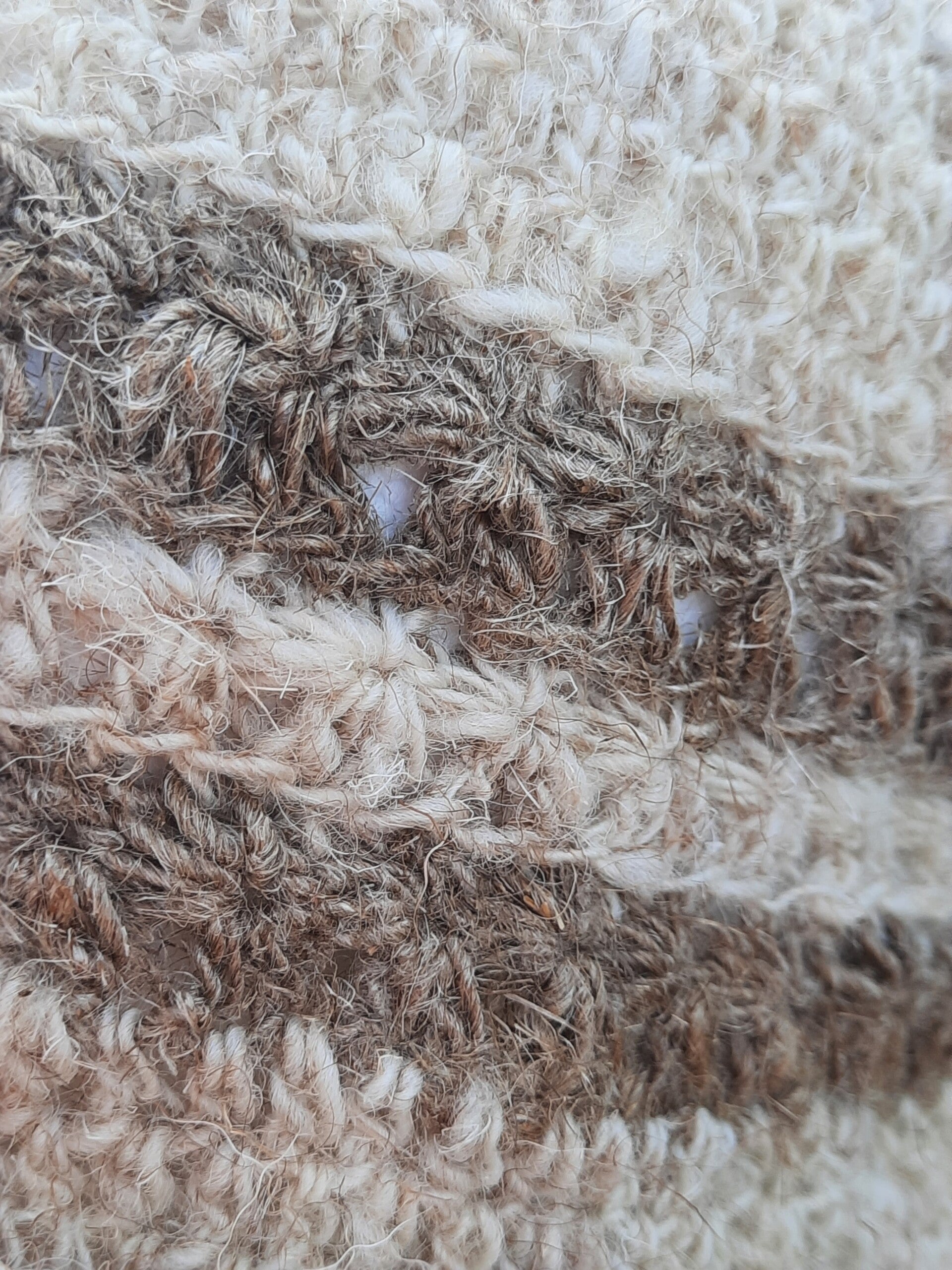 90% handgesponnene Schurwolle vom Coburger Fuchsschaf „Ruth“ von der Oberahr & 10% handgesponnener Flachs (Leinen)